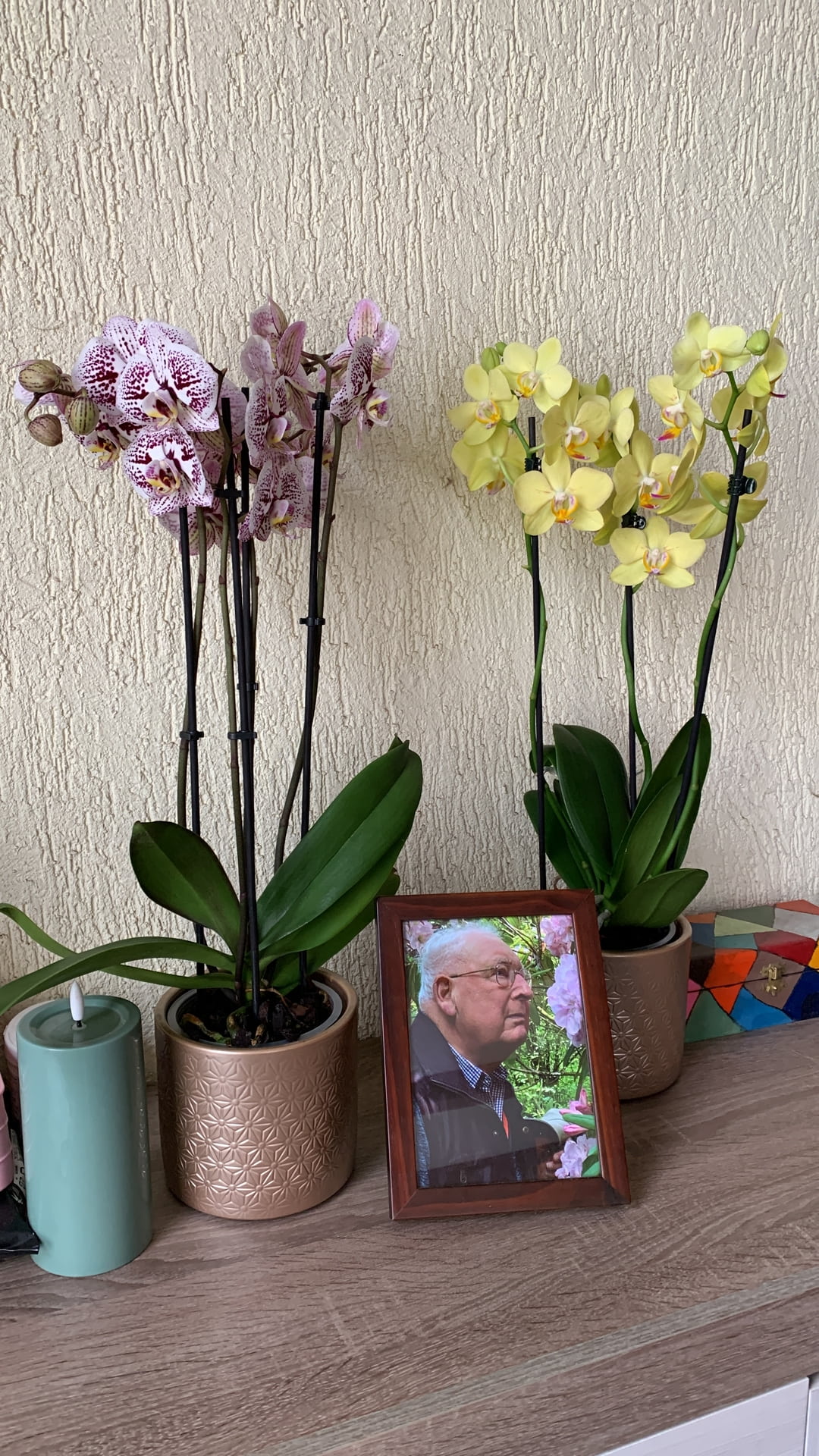 Gelukkig had ik ruime wintervoorraad in vriezer en voorraadkast zodat ik bij gladheid en sneeuw niet weg hoefde om naar de supermarkt te gaan, maar vandaag ben ik toch door het tuincentrum geracete voor wat orchideeën naast de foto van mijn vader die vandaag 4 jaar geleden is overleden.
