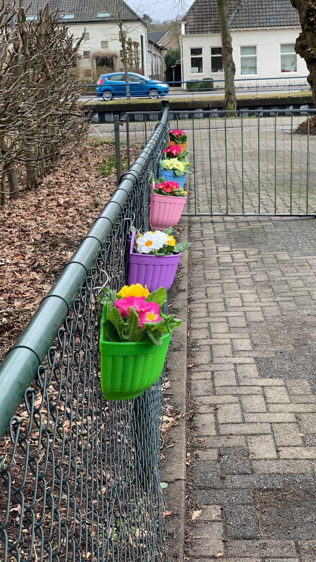 En voor mezelf vrolijke primula's die in online gekochte kleurige hangbakken nu de oprit opsieren. Blij mee!